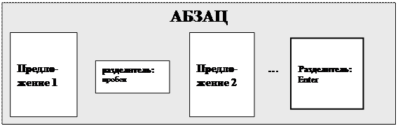 Из приведенного рисунка видно, что в качестве разделителя между словами всегда используется пробел, разделителями между группами слов являются знаки препинания. Каждое предложение заканчивается знаком препинания («.», «!», «?»), за которым в обязательном порядке следует пробел. Можно также представить следующую структуру текстовой информации по уровням вложенности