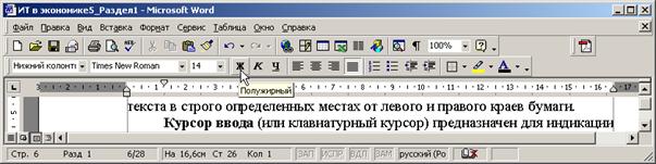 Меню – интерфейсный элемент, предназначенный для организации доступа к функциям, возможностям и технологиям программы. В меню программы все функции системы имеют определенные имена. Каждая функция располагается в строго определенном месте. Панель инструментов «Стандартная» -размещает в себе наиболее часто используемые общие функции системы, оформленные в виде инструментов (мелких квадратных кнопок, в которых размещено изображение-пиктограмма). Каждая функция имеет строго определенную пиктограмму. Наличие панелей инструментов существенно упрощает работу с программой, т.к. кнопки панели инструментов позволяют получить быстрый доступ к часто используемым функциям системы. Однако, следует отметить, что доступ к функциям системы через горячие клавиши и сочетания клавиш является часто гораздо более быстрым способом. Панель инструментов «Форматирование» размещает в себе инструменты для форматирования (оформления внешнего вида) текстовой информации. Масштабные линейки предназначены для визуального сопоставления текстовой информации на экране с ее фактическими размерами на листе бумаги после вывода документа на печать. Масштабные линейки используются для форматирования абзацев (задания отступа, выступа, левой и правой границы), а также точек табуляции (табулстопов) для возможности размещения текста в строго определенных местах от левого и правого краев бумаги. Курсор ввода (или клавиатурный курсор) предназначен для индикации текущей точки вставки текста, т.е. места документа, куда в данный момент при нажатии клавиш будет вводится текст. Существуют методы перемещения курсора, о которых будет сказано позднее. Текстовый курсор мыши предназначен для быстрого перемещения курсора ввода по документу (для перемещения курсора ввода текста необходимо переместить курсор мыши двигая манипулятор мышь к нужной точке и нажать левую кнопку мыши). Текстовый курсор мыши также используется для выделения блоков текстовой информации, их перемещения и копирования. Графический курсор мыши (или указатель). Текстовый курсор мыши при попадании в область панелей инструментов или меню принимает вид белой наклонной стрелки (см. рис.). Это означает, что при нажатии левой кнопки мыши будет выполнено какое-либо действие.