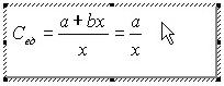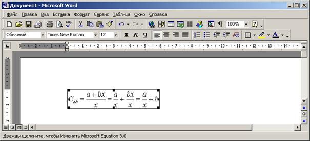 Обратите внимание, что даже простая однострочная формула, набранная в редакторе формул, выглядит совершенно иначе, чем если бы она просто набиралась как текст. Например, формула Cед = ax + bx. Объясняется это прежде всего тем, что в редакторе формул существует большое количество настроек, определяющих вид формулы: от параметров шрифтов до расстояния от текста числителя до черты дроби. Поэтому, в большинстве случаев, рекомендуется даже простейшие однострочные формулы набирать в редакторе формул, чтобы все формулы в документе были бы одинаково оформлены.