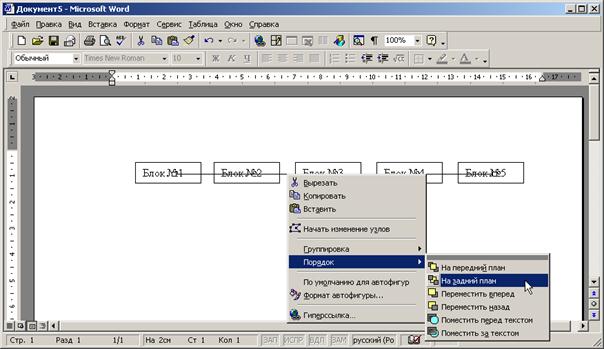 Каждый объект встроенной графики создается на отдельном слое, что позволяет управлять наложением объектов друг на друга. Использование слоев может существенно повысить скорость создания блок-схем. Предположим требуется создать пять графических объектов «Надпись», расположенных последовательно и соединенных линиями.