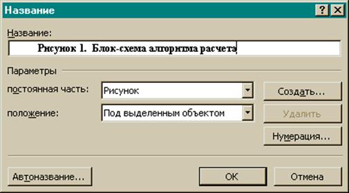 Оформление рисунков и иллюстрацией также связано с использование средства Название. Для создания подписей вида «Рисунок №..» под рисунками и иллюстрациями необходимо: - выделить объект графики; - Вст а вка ® Н азвание… - в поле Название после текста «Рисунок 1» ввести точку, затем пробел, затем текст под рисуночной подписи (например, «Блок схема алгоритма расчета). Результат представлен на рисунке ниже: