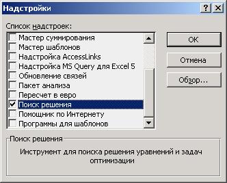 В Excel имеется стандартных механизм разрешения подобных задач заключенный в надстройке «Поиск решения». Для его использования необходимо активировать данную надстройку: С е рвис ® Н адстройки …