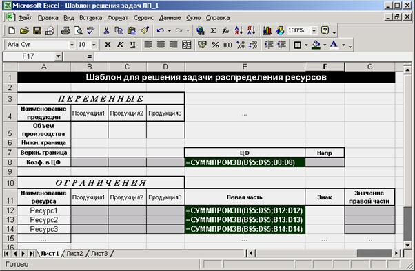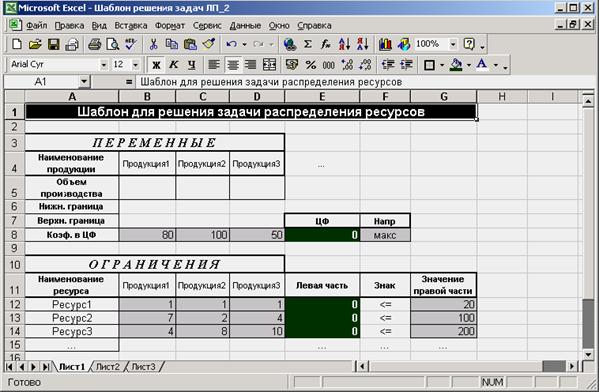 Отключить режим отображения формул можно аналогичным способом. После ввода формул необходимо ввести исходные данные задачи. Исходные данные Имеются три вида продукции, объемы производства обозначены соответственно x1, x2, x3. Для производства требуются три ресурса (например, труд, сырье, финансы). Использование каждого ресурса для единицы каждого вида продукции выражается коэффициентами при переменных x1, x2, x3 в следующей системе неравенств: