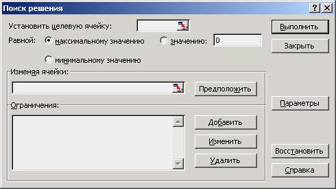 5. Нажать кнопку «Параметры» диалога «Поискрешения», что приведет к активации диалога «Параметры поиска решения».