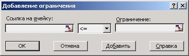 и в появившемся диалоге заполнить параметры ограничения для каждого неравенства: - в поле «Ссылка на ячейку» выбрать ячейку, содержащую формулу левой части соответствующего неравенства, т.е. для первого неравенства выбрать ячейку E12; - далее знак ограничения оставить без изменений; - в поле «Ограничение» необходимо ввести имя ячейки, содержащей значение правой части неравенства (для первого неравенства это G12). 2. Рассмотренную в п. 1 процедуру повторить для каждого неравенства. Таким образом, после ввода параметров диалог «Поиск решения» примет следующий вид: