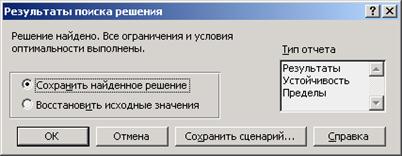 В появившемся диалога необходимо все оставить без изменения за исключением переключателя «Линейная модель» ® Нажать Ok. 6. В диалоге «Поискрешения» нажать кнопку «Выполнить». Если оптимальное решение существует на экран будет выведен следующий