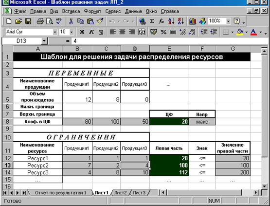 1. Опишите сущность задачи распределения ресурсов. 2. Математическая форма записи задачи распределения ресурсов. 3. Как математическая форма записи связывается с шаблоном для решения задачи линейного программирования? 4. В чем состоит поиск решения задачи линейного программирования? Каким образом он производится? 5. Опишите порядок выполнения работы. 6. О чем говорят результаты расчета в случае успешного поиска оптимального значения? 7. Как минимизировать целевую функцию средствами Excel при заданной системе ограничений? 8. Опишите порядок выполнения работы. Как должна быть оформлена работа? Как необходимо представлять результаты проделанной работы?
