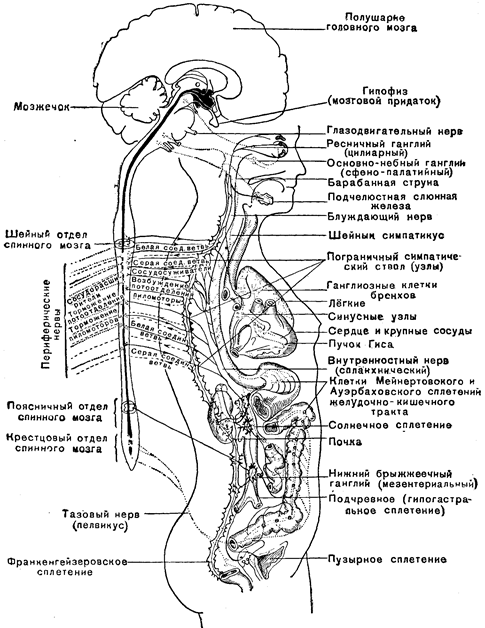 Симпатическая нервная система регулирует идущий к различным аппаратам поток раздражений, делая их более или менее чувствительными по отношению к раздражениям, которые к ним поступают. Это относится и к нервной системе, и к органам чувств, и к поперечнополосатой мускулатуре. Не вызывая непосредственно в мышце никаких внешних двигательных эффектов, симпатическая нервная система адаптирует, приспособляет её к нуждам момента, делая её более или менее чувствительной к двигательным импульсам, которые к ней направляются, устанавливая (по выражению Е. Сеппа) «шлюзы» по отношению к ним на ту или иную высоту. В отличие от парасимпатической нервной системы, отдельные части которой функционируют независимо друг от друга, симпатическая нервная система (как это особенно отмечается У. Кенноном) действует как единое целое. Её возбуждение даёт разлитой эффект, многообразно сказывающийся на различных функциях и сторонах жизнедеятельности организма. Возбуждение симпатической нервной системы ускоряет деятельность сердца, расширяет его сосуды, суживает сосуды кожи и внутренностей, а также просвет бронхов, замедляет деятельность пищеварительного тракта, мобилизует сахар в печени, образуя при раздражении симпатических нервов вещество, аналогичное адреналину. Таким образом, деятельность симпатической нервной системы охватывает именно те стороны жизнедеятельности внутренних органов, которые характерны для эмоций. Можно считать установленным, что эмоциональные реакции связаны с деятельностью симпатической нервной системы. Тем самым эмоции связаны и с центральными аппаратами симпатической нервной системы в подкорке — с гипоталамусом и с таламусом, которые, по Орбели, являются её центральными аппаратами. Особенно большое значение таламуса в физиологии эмоций твёрдо установлено ещё исследованиями В. М. Бехтерева и новейшими работами Г. Хэда, Берда (Bard) и др.