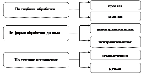 Простая сводка предполагает подсчет общих итогов по совокупности в целом. При сложной сводке проводится целый комплекс операций, включающий в себя группировку единиц наблюдения, подведение групповых и общих итогов, а также оформление результатов в виде статистических таблиц. При централизованной сводке весь процесс обработки информации от первичного материала до получения итоговых показателей происходит в одной организации (комитет, фонд, комиссия). При децентрализованной сводке обработка материала поэтапно проводится несколькими организациями (структурными подразделениями). Так, при обработке статистической отчетности отчеты предприятий и организаций сводятся территориальными статистическими органами по каждому субъекту РФ, а итоги по региону передаются в Росстат, который определяет экономические показатели по России в целом. Ручная сводка предполагает, что подсчет групповых и общих итогов производится вручную. Применяется только для небольших массивов данных и в последнее время проводится крайне редко. Автоматизированная (компьютерная) сводкав полном объемеосуществляется с помощью компьютерной техники.