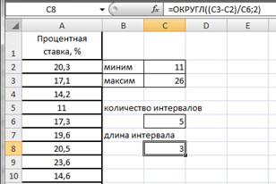 Вычислим длину интервалов, для чего в ячейке С8 введем формулу =ОКРУГЛ((C3-C2)/C6;2) (рис.2.19).