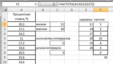 Подсчитаем частоты – в интервал считаем те значения, которые больше нижней границы интервала или равны ей и меньше верхней границы. Воспользуемся функцией ЧАСТОТА. Для этого в ячейке F2 введем формулу =ЧАСТОТА(A2:A31;E2:E7). Протянем F2 маркером заполнения вниз до F8. Формулу в этом примере необходимо ввести как формулу массива. Выделим диапазон F2:F8, нажмем клавишу F2, а затем нажмем клавиши CTRL+SHIFT+ВВОД (рис.2.21). Если формула не будет введена как формула массива, отобразится только одно ее значение в ячейке F2.