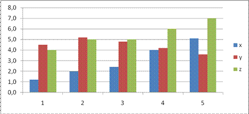 Рассмотрим таблицу на рис. 2.1. Если показатели x, y, z являются независимыми, то подходит «Обычная гистограмма». Эта диаграмма позволит наглядно сравнить значения этих трех показателей. Каждому показателю будет соответствовать свой цвет прямоугольников. Введите данные с рисунка 3.14 в диапазоне А1:С6. Выделите диапазон А1:С6, щелкните курсором мыши значок «Мастер диаграмм» на панели инструментов, и в появившемся окне выберите тип «Гистограмма», вид «Обычная гистограмма», как показано на рисунке 3.13, и нажмите кнопку «Готово» (или «OК»). Полученная диаграмма изображена на рисунке 3.15.