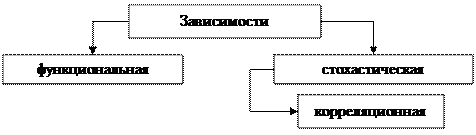 Современная наука об обществе объясняет суть явлений через изучение их взаимосвязи. Например, объем валютных торгов зависит от спроса на валюту, который в свою очередь определяется состоянием экономики, активностью внешнеэкономической деятельности субъектов и др., объем продукции предприятия связан с численностью работников, стоимостью основных фондов и т.д. Различают два типа взаимосвязей между различными явлениями и их признаками: функциональную или жестко детерминированную и статистическую или стохастически детерминированную. Функциональная (жестко детерминированная) связь – это вид причинной зависимости, при которой определенному значению факторного признака соответствует одно или несколько точно заданных значений результативного признака. Этот вид связи встречается чаще в естественных науках, но так же и в экономике. Например, при простой сдельной оплате труда связь между оплатой труда y и количеством изготовленных изделий x при фиксированной расценке за одну деталь, например, 7 руб. можно выразить формулой y = 7x Стохастическая связь – это вид причинной зависимости, проявляющейся не каждом отдельном случае, а в общем, среднем, при большом числе наблюдений. Например, зависимость цены товара от качества. В отдельных случаях соотношение спроса и предложения может привести к тому, что товар худшего качества будет продан по более высокой цене, но при достаточно большом числе продаж, аналогичный товар лучшего качества будет иметь более высокую цену. Другой пример, зависимость роста детей от роста родителей. В семьях, где родители более высокого роста, дети тоже имеют рост выше среднего. Однако эта зависимость проявляется лишь при большом числе наблюдений. Среди взаимосвязанных признаков одни могут рассматриваться как определенные факторы, влияющие на изменение других, а вторые как следствие, результат влияния первых. Соответственно первые, то есть признаки, влияющие на изменение других, называют факторными, а вторые – результативными. Стохастические взаимосвязи могут быть изучены различными способами. Наиболее известный из них метод изучения корреляционных связей. Корреляционная связь (от английского слова correlation – соотношение, соответствие) - частный случай стохастической связи, состоящей в том, что c изменением факторного признака (х) закономерным образом изменяется среднее значение результативного признака (y), в то время как в каждом отдельном случае y может принимать множество различных значений. Корреляционная связь между признаками может возникать различными путями. Важнейший путь – взаимосвязь вариации результативного признака с вариацией факторного признака. Обычно в этом случае говорят о взаимосвязи признаков. Отсюда задача измерения силы корреляционной связи состоит в нахождении меры совместной вариации двух признаков. Типы взаимосвязей по характеру зависимости, различаемые в статистике, представлены на рисунке 5.1.