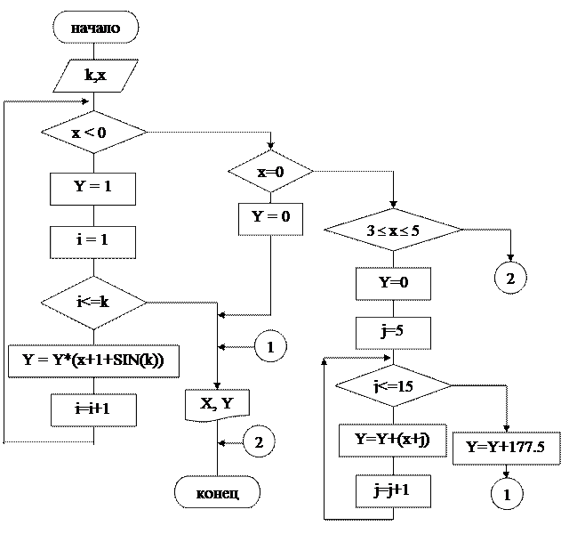 Программа: INPUT K, X IF X<0 THEN Y=1 FOR i=1 TO k Y=Y*(X+1+SIN(K)) NEXT i PRINT X,Y ELSEIF X=0 THEN Y=0 PRINT X, Y ELSEIF X>=3 AND X<=5 THEN Y=0 FOR j=5 TO 43 Y=Y+(X+j) NEXT j Y=Y+117.5 PRINT X, Y END IF END Рассмотрим программу: FOR X=0 TO 15 PRINT TAB (X); “*” NEXT X STOP Результат выполнения этой программы представлен на рис. 1