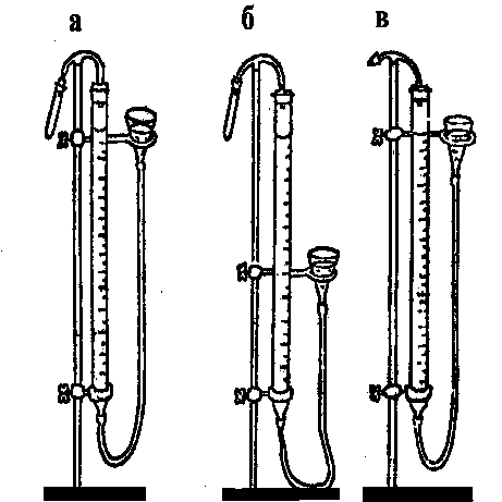 1.Три бюретки на 50 мл для сбора газа, три воронки и три пробирки, соединенных резиновыми трубками с бюретками (см. рис. 6.2). Бюретки и воронки наполнены дистиллированной водой. 2.Три стакана на 100 мл. 3. Секундомер или часы. 4. Цинковые образцы. 5.Растворы солей H2SO4, CuSO4, FeSO4, PbSO4, NiSO4, CdSO4, CoSO4, SnSO4 (концентрации от 0.001 до 1.0 N).