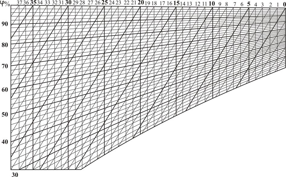 Рисунок 2.2 − График для определения относительной влажности воздуха с помощью психрометра Ассмана Таблица 2.2 − Регистрация результатов измерений и их обработки