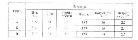 10. Порівняти та дати оцінку якості 3 виробів-аналогів (котли газові для опалення), характеристики яких наведені в таблиці. Вважаючи, що значення показників якості мають однакову вагу, визначити величини відносних одиничних показників якості кожного виробу. Розрахувати значення абсолютних узагальнених показників якості кожного виробу. Які висновки можна зробити за результатами порівняння значень абсолютних показників якості? 11. Порівняти та дати оцінку якості 5 виробів-аналогів (телевізори), деякі характеристики яких наведені в таблиці.