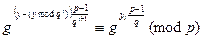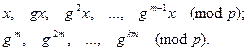 Заметим, что все элементы последовательности попарно различны, ибо g – первообразный корень. Вычислим также степень Допустим, что уже найдены