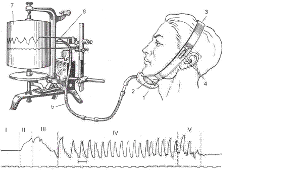 1 – специальный футляр, в которй помещен резиновый баллон (2); 3 – фиксирующая повязка; 4 – градуированная шкала, определяющая степень прижатия подбородка к баллону; 5 – резиновый шланг для воздушной передачи; 6 – капсула Марея; 7 – кимограф. Проведение работы. Мастикациограмма производится с помощью резиновой манжеты, которая при помощи повязки с резиновыми перемычками прикрепляется к подбородочной области и посредством резиновой трубки соединяется с капсулой Марея. Движения нижней челюсти записываются на кимографе. Исследования проводятся на человеке. Мастикациограмма представляет собой ряд следующих друг за другом волнообразных кривых, отображающих комплексные движения нижней челюсти, связанные с опусканием и подъемом ее до смыкания зубов. В клинике на основании мастикациограммы, записанной до и после лечения, устанавливается характер функциональных изменений в работе зубочелюстной системы. Мастикациограмму записывают на кимографе: 1) при жевании мягкого хлеба; 2) при жевании сухарей.
