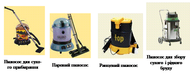 З одного боку, професійна прибиральна техніка повинна мати максимум можливостей, а з іншого – бути простою в застосуванні і безпечною. До професійної прибиральної техніки відносять: пилососи для сухого прибирання, пилососи для збору сухого і рідкого бруду, пилососи-щітки для сухого прибирання, ранцеві пилососи для сухого прибирання, парові пилососи (рис 4.27); екстракторні машини для чищення коврових покриттів, сушили для підлог, роторні машини для догляду за підлогами, мийні і чистячи машини по догляду за підлогами, машини механічні підмітальні, тощо.