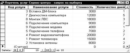 Рис. 2.18. Вид бланка QBE для запроса по всем услугам Сохранить запрос с именем Перечень услуг Сервис-центра в диалоговом окне Сохранение, которое появляется после нажатия кнопки Сохранить или закрытия окна запроса. Данное имя затем автоматически будет выбрано в качестве заголовка отчета. Проверить результат выполнения запроса, показанный на рис. 2.19, для исходных данных из таблиц 2.5–2.7, нажав на кнопку Открыть из окна базы данных или перейдя в режим Таблица через меню Вид/Режим таблицы из окна запроса. При появлении ошибки в результатах следует вернуться в режим Конструктор, найти и исправить их. Результаты выполнения остальных запросов будут приведены в табличном виде.