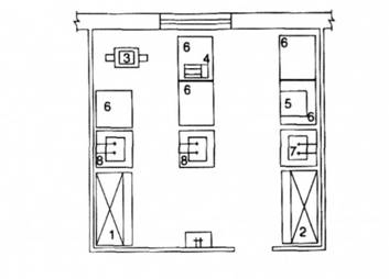 Рис. 14. Розміщення обладнання в доготовочному цеху: 1" 2- холодильні шафи; 3- механічна м'ясорубка; 4- розпушувачі; 5 - машина для різання овочів; 6 - виробничий стіл; 7,8 - мийні ванни.