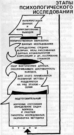 Рис, 11.5. Этапы психологического исследования 2. Место проведения исследования должно обеспечивать изоляцию от внешних помех (по меньшей мере эти влияния необходимо учитывать), отвечать санитарно-гигиеническим и инженерно-психологическим требованиям, т. е. обеспечивать определенный комфорт и непринужденную рабочую обстановку. 3. Техническое оснащение исследования должно соответствовать решаемым задачам, всему ходу иссле- дования и уровню анализа получаемых результатов. 4. Подбор испытуемых должен обеспечить их качественную однородность. 5. Исследователь (или экспериментатор) неизбежно влияет на ход проводимой работы на всех ее этапах, от планирования до выводов и рекомендаций. 6. Инструкция составляется еще на стадии планирования работы. Инструкция должна быть четкой, краткой, однозначной. 7. Протокол исследования должен быть одновременно полным и целенаправленным (избирательным). 8. Обработка результатов исследования — это количественный и качественный анализ и синтез полученных в ходе исследования данных. Основным принципом построения психологического исследования является принцип качественного анализа особенностей протекания психических процессов. Важно не только, сколько и какие задачи выполнил испытуемый, главное — как он работал. Каков характер ошибок?