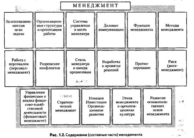 Рис. 1.1. Место менеджмента в науке о рыночной экономике Содержание менеджмента складывается из следующих основных частей (рис. 1.2). 1. Целеполагание (миссия, цели, задачи). В этой части рассматривается определение смысла и главного направления деятельности организации, установление конечных результатов ее деятельности, а также путей, ведущих к их достижению. 2. Организация (организационная структура и организаторская работа). Рассматривается построение организации, ее составные части, их связи и взаимодействие. 3. Система управления (органы и объекты управления). Рассматривается структура органов власти, место и роль менеджера, система движения командной информации и информации состояния (обратной связи). 4. Деловые коммуникации. Рассматриваются процессы передачи информации, делового общения как внутри организации между ее участниками, так и с внешним миром. 5. Функции менеджмента. Рассматриваются основные задачи, решаемые менеджером (что он должен делать). 6. Методы менеджмента. Рассматриваются рычаги управления организацией, способы, с помощью которых менеджер достигает ее целей (как он это должен делать). 7. Работа с персоналом (персонал-менеджмент). Рассматриваются формы, методы и содержание кадровой работы в организации. 8. Разрешение конфликтов. Рассматриваются происхождение и природа конфликтов в организации и пути их устранения. 9. Стиль менеджера и имидж организации. Рассматриваются соответствующие понятия, роль стиля и имиджа в достижении организацией своих целей, а также необходимые для этого рекомендации. 10. Выработка и принятие управленческих решений. Рассматриваются теория и практика рационального выбора менеджером наилучшего в данных условиях (оптимального) способа действий. 11. Прогнозирование. Рассматриваются формы и методы предвидения менеджером проблемной ситуации и их использование для практической деятельности. 12. Риск (риск-менеджмент). Рассматривается происхождение риска менеджера. Обосновываются способы рационального поведения в условиях неопределенности ситуации и связанного с этим неизбежного риска. 13. Управление финансами и анализ финансово-хозяйственной деятельности организации (финансовый менеджмент). Рассматриваются основные документы, описывающие финансовую деятельность организации, анализируются показатели, характеризующие ее финансово-хозяйственное состояние. 14. Стратегический менеджмент. Рассматриваются формы и методы выработки линии поведения (политики) организации на длительную перспективу. 15. Новации, инвестиции и организационное развитие. Рассматриваются формы и методы новаций и инвестиций, осуществляемых организацией, а также пути совершенствования ее организационной структуры и способов функционирования. 16. Этика менеджмента и организационная культура. Рассматриваются нравственные нормы и ценностные ориентиры организации. 17. Развитие основных идей менеджмента. Рассматриваются (в исторической последовательности) основные концепции, принципы и школы менеджмента, их современная роль и место.