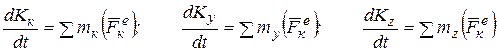 где Полученное уравнение выражает следующую теорему моментов в дифференциальной форме для системы: производная по времени от главного момента количества движения системы относительно некоторого неподвижного центра равна сумме моментов всех внешних сил системы относительно того же центра. Проецируя обе части равенства (5.10) на неподвижные оси Охуz, получим:
