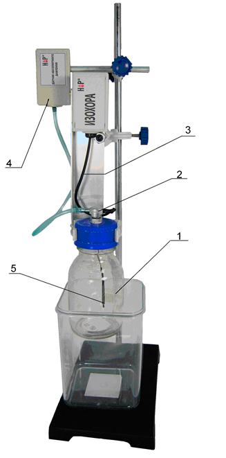 · Штатив · Сосуд с водой Установка для изучения изохорного процесса (рис. 1) представляет собой цилиндрический стеклянный сосуд объемом 250 мл (1) с герметично завинчивающейся крышкой. В крышку вмонтирован штуцер (2), через который осуществляется вывод кабеля датчика температуры (3), а также подключение датчика давления (4). Чувствительный элемент датчика температуры расположен в центре газового объема (5).