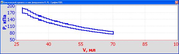 1. При запущенном сценарии «Циклический процесс» войдите в режим проведения измерений, нажав кнопку 2. Измеряемые давление и объем газа должны составить примерно 150 кПа и 40 мл соответственно (калибровка датчика объема учитывает объем трубки, соединяющей резервуар с датчиком давления). 3. Опустите резервуар с исследуемым газом в холодную воду (желательно с температурой 5 - 10°С). Подождите пока газ не придет в термическое равновесие с водой (это занимает не более минуты). При охлаждении газа его давление падает, что и отражается на экране (график и цифровой индикатор). 4. Плавно вращая рукоятку винта, переведите поршень в положение, соответствующее объему газа 65 мл. 5. Опустите установку в горячую воду. Подождите до тех пор, пока давление газа, показываемое цифровым индикатором, перестанет изменяться. 6. Плавно вращая рукоятку винта, верните поршень в исходное положение (минимальный объем газа). 7. Опустите установку в холодную воду. Подождите, пока газ остынет, и его температура и давление (на экране) перестанут изменяться. 8. Таким образом, завершится циклический процесс, состоящий в изотермическом увеличении объема газа, изохорном росте давления при увеличении температуры, изотермическом уменьшении объема и изохорном уменьшении давления при охлаждении газа. Для остановки измерений нажмите кнопку 9. Характерный вид полученного при измерениях графика показан на рис. 2. 10. В нижнем правом углу экрана выводится значение работы, которая была совершена газом в данном циклическом процессе. Работа рассчитывается как сумма величин pi×DVi, рассчитанных для каждой из записанных точек процесса (i – номер точки). Величина ×DVi = Vi+1 - Vi положительна при расширении газа и имеет отрицательный знак при его сжатии. Отметим, что численно работа равна площади замкнутой фигуры, ограниченной графиками составляющих цикл процессов.
