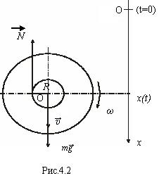 Рис.4.1 Маятник Максвелла является основной частью лабораторной установки, содержащей электромагнит, фотодатчики и электронный измеритель времени. Если сначала поднять маятник до некоторой высоты, наматывая нити подвеса виток к витку на валик путем его поворота, а затем отпустить, то он достаточно длительное время будет совершать периодические движения вниз-вверх. Отсюда, собственно, и название системы «маятник». В момент достижения маятником нижнего положения происходит упругий удар, в результате которого скорость поступательного движения получает противоположное направление, практически не меняя своей величины. Направление же вращательного движения остается прежним. В результате этого нити подвеса будут навиваться на ось в противоположном направлении, и маятник будет подниматься вверх. Процесс перемещения маятника вниз-вверх будет многократным. Если пренебрегать силами сопротивления, то маятник Максвелла в целом можно рассматривать как консервативную систему, а его движение – соответствующее закону сохранения механической энергии. Пусть m – масса маятника, I – его момент инерции. Положение маятника в текущий момент времени будем определять координатой x центра масс относительно его начального положения x = 0 в момент t = 0. На рис.4.2 указаны основные силы, действующие на тело маятника, и направления его движений. Считаем, что нити подвески маятника практически вертикальны. Заменяем действие двух нитей на тело их суммарной реакцией N. На основании законов динамики плоско-параллельного движения тела имеем два уравнения:
