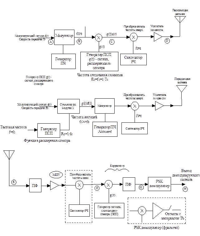 СИСТЕМЫ С РАСШИРЕНИЕМ СПЕКТРА Термин расширение спектра был использован в многочисленных военных и коммерческих системах связи. В системах с расширенным спектром каждый сигнал-переносчик сообщений требует значительно более широкой полосы радиочастот по сравнению с обычным модулированным сигналом. Более широкая полоса частот позволяет получить некоторые полезные свойства и характеристики, которые трудно достичь другими средствами. Расширение спектра представляет собой метод формирования сигнала с расширенным спектром с помощью дополнительной ступени модуляции, обеспечивающей не только расширение спектра сигнала, но и ослабление его влияния на другие сигналы. Дополнительная модуляция никак не связана с передаваемым сообщением. Широкополосные системы находят применение благодаря следующим потенциальным преимуществам: - повышенной помехоустойчивости; - возможности обеспечения кодового разделения каналов для многостанционного доступа на его основе в системах, использующих технологию CDMA; - энергетической скрытности благодаря низкому уровню спектральной плотности; - высокой разрешающей способности при измерениях расстояния; - защищенности связи; - способности противостоять воздействию преднамеренных помех; - повышенной пропускной способности и спектральной эффективности в некоторых сотовых системах персональной связи; - постепенному снижению качества связи при увеличении числа пользователей, одновременно занимающих один и тот же ВЧ канал; - низкой стоимости при реализации; - наличию современной элементной базы (интегральных микросхем).