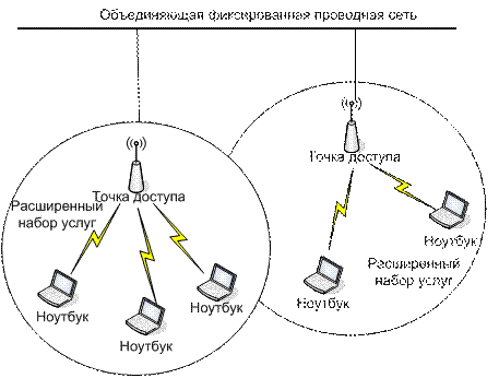 Несколько беспроводных терминалов подключаются к точке доступа с помощью радиосигналов 802.11. Эта конфигурация называется базовый набор услуг (base service set - BSS). Расширенный набор услуг (extended service set-ESS) - это набор двух и более BSS, формирующих единую подсеть. Так как многие беспроводные корпоративные локальные сети нуждаются в подключении к проводной локальной сети (для доступа к файловым серверам, принтерам, Интернету), они должны работать в режиме инфраструктуры. Если абонент выходит, за зону действия одной точки доступа" то происходит передача вызова, точно так же, как это происходит в сотовой сети. Таким образом, при наличии сессии устройство Wi-Fi передается на обслуживание от одной точки доступа к другой. Моментальный режим работы, известный как независимый базовый набор услуг (Independent Basic Service Set - IВSS) - это набор пользовательских терминалов 802.11, которые подключены непосредственно друг к другу без использования точки доступа или любого другого подключения к проводной сети.