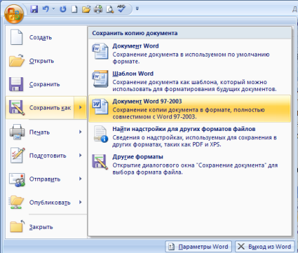 Пункт "Из существующего документа" предназначен для создания нового файла на основе уже имеющегося документа. При выборе этого пункта пользователь должен указать на диске уже имеющийся документ. При этом содержимое указанного файла будет размещено в новом созданном документе. Word 2007 по умолчанию сохраняет файлы в формате.docx. Этот формат не могут читать старые версии программы. Поэтому, чтобы документ был совместим с предыдущими версиями Word, необходимо сохранять файл в "режиме ограниченной функциональности". Это делается с помощью меню "Сохранить как…" кнопки "Office".