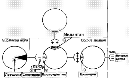 Сурет 6.1.1. Дофаминмиметикалық дәрілердің әсер ету механизмі Допамин (Dopaminum) дофамин мен адренергиялық рецепторларды белсендіретін және едренергиялық заттар үшін тән бір қатар фармакологиялық сипатқа ие (тікелей емес адренергиялық әсері бар) кардиотоникалық зат. Дофаминнің әсерінен шеткері тамырлардың қарсы әрекеті жоғарылайды, систолалық артериалды қысым жоғарылайды; жүрек жиырылулары күшейеді, жүректің лақтырысы артады. Қолдану көрсеткіштері мен мөлшерленуі. Түрлі этиологиядағы шоктар: кардиогенді, жарақатты, септикалық, операциядан кейінгі, гиповолемиялық ж.т.б., сонымен, әртүрлі патологияларда дамитын жедел жүрек-тамыр және бүйрек жеткіліксіздіктерінде гемодинамиканы жақсарту үшін, артериалдық гипотензия, интоксикациялар кезінде. Көк тамыр ішіне тамшылатып 0,5% ерітінді енгізіледі (араластыру үшін 5% глюкоза ерітіндісінің 125 мл немесе натрий хлоридінің изотониялық ерітіндісін пайдаланады) енгізу жылдамдығы минутына 2-10 тамшыдан, енгізуді гемодинамика мен ЭКГ бақылауында өткізеді. Кері көрсеткіштері. Тахиаритмия мен феохромоцитомада, тиреотоксикоздарда, шеткері тамырлардың бітелу ауруларында, аталық безінің гипертрофиясы, бронх демікпесі мен жүктілік. Жанама әсерлері. Лоқсу, құсу, шеткері тамырға тән вазоконструкция, артериалдық қысым төмендеуі немесе жоғарылауы, тахикардия, бас ауыруы, кеуде маңының ауырсынулары т.б. Шығарылу түрі. 0,5 және 1% концентратты инфузиондық ерітіндідегі 5 мл ампулада; 2% ерітіндіні 10 мл мөлшерінде және 4% ерітіндіні 5 мл егуге арналған ампулаларда. Рецепт үлгісі. Rp.: Sol. Dopamini 0,5% -2 ml D.t.d. N. 10 in amp. S. Араластыру үшін. Тамшылап енгізу үшін (минутына 2-10 тамшыдан). # Апоморфин (Apomorphinum) морфиннен алынған жартылай жасанды алкалоид, әлсіз ауыруды басатын белсенділікке ие, әрі тыныс алу орталығын күйзеліске ұшыратады, алайда оның сопақша мидың хеморецепторлық босату аймағына айқын ынталандырғыш әсері бар, осыған орай күшті құстыру әсерін білдіреді. Қазіргі уақытта апоморфин дофаминдік рецепторлардың телімді агонисті екені анықталды. Апоморфиннің дофаминдік рецепторларға әсері оның құстыру әсеріне де байланысты. Қолдану көрсеткіштері мен мөлшерленуі. Асқазанда улы заттар мен сапасыз тағам өнімдерінің болуы кезде құстыратын зат ретінде, маскүнемдікте – кешенді терапия ретінде алкоголге деген құстыру шартты-рефлекторлық реакциясын тудыру үшін қолданады. Ересектерге тері астына 2-5 мг, балаларға 1-3 мг, маскүнемдік кезінде алкоголь қабылдаудан 3-4 минут бұрын 2-3 мг мөлшерінде күніне 1-2 рет береді.
