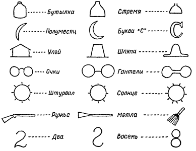 Рис. 6. Искажающее влияние словесной памяти на зрительную. Средняя колонка: фигуры, показанные испытуемым двух групп: левая колонка— рисунки испытуемых 1-й группы в соответствии с предложенными названиями; правая — рисунки испытуемых 2-й группы в соответствии с предложенными названиями. (Из кн Экспериментальная психология Т II М, 1963)