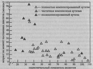 В силу того, что некоторые пациенты утрачивали аутистические черты в периоды от нескольких месяцев (случаи 1 и 3) до полутора лет, было решено проводить систематическое отслеживание дальнейшего развития 50 детей с аутизмом. Во всех ли случаях исчезновение аутистических черт является результатом компенсации? Какой из факторов можно рассматривать благоприятным для прогноза? Является ли умственный дефицит у таких детей вторичным по отношению к аутизму, как постулируется многими исследователями? Данные дети отслеживались на протяжении 3—10 лет, в среднем около 5 лет. Средний возраст пациентов 7 лет. Пять пациентов умерло: у одного был острый рассеянный склероз Шильдера; у другого возникло неконтролируемое кровоизлияние при операции папиломы хороидного сплетения; у третьего была трисомия 21-й хромосомы, еще у одного была умственная отсталость с гиперкинезами и судорожными припадками. Пятый ребенок (случай 14 на рисунке 2) наблюдался на нескольких последующих обследованиях. В раннем возрасте он развивался нормально, в том числе и в сфере социального взаимодействия. Ухудшение наступило после начала миоклонических припадков в возрасте нескольких месяцев. Аутистические симптомы появились раньше интеллектуального ухудшения. Отмечались синдром Денди—Уолкера с большими эпилептическими припадками и прогрессирующая гидроцефалия, препятствующая нормальному развитию, в результате чего требовалась операция по шунтированию. Ребенок постоянно регрессировал и умер в возрасте 8,5 лет, учась в школе для умственно отсталых. Он оставался аутич-ным, глубоко дефективным и слепым; у него продолжались припадки различного типа. Связь с пятью детьми была утрачена; одна семья откликнулась и констатировала, что их ребенок лишь отчасти нормален. С 32 из оставшихся 39 либо проводились формальные обследования специалистами, незнакомыми с первичными результатами, либо предоставлялись отчеты из общеобразовательных или вспомогательных школ. У оставшихся 7 детей письменная информация была дополнена информацией, полученной по телефону из клиники по проблемам речи и слуха, от врачей, социальных работников, а также от родителей, с которыми проводился тщательный опрос о развитии ребенка. Ни один из детей не был включен в специальную лечебно-психокоррекционную программу, направленную на работу именно с психотическими симптомами. График 1 показывает отношение между уровнем адаптивного поведения и возрастом во время первичного обследования и сохранением аутистических симптомов в дальнейшем. У пациентов, представленных на графике пустыми символами, аутизм исчез, и они стали адекватно социально взаимодействовать с людьми; те, которые обозначены на графике полузакрашенными символами, скомпенсировались частично. Черные символы обозначают тех пациентов, у которых аутистическое одиночество сохранилось. Этот график иллюстрирует два важных аспекта.