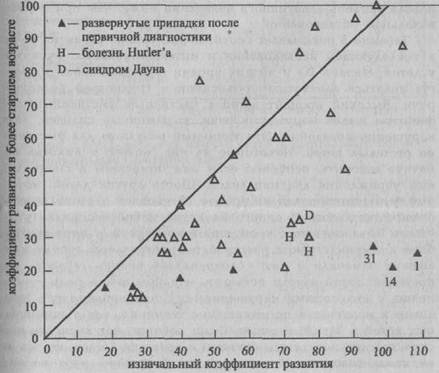 График 2. Связь между изначальным и последующим коэффициентами развития у аутичных пациентов последующем обследовании дети показали уровень развития ниже, чем при первоначальном, несмотря на то что многие из них потеряли аутистическое поведение и смогли устанавливать нормальные социальные контакты. У некоторых детей наблюдались известные тормозящие развитие (замедляющие) процессы, такие, как трисомия 21-й пары хромосом, болезнь Харлера, у других, отмеченных на графике черными символами, прогрессировали большие эпилептические припадки. У нескольких детей значительное ухудшение не могло быть объяснено никакими специфическими заболеваниями. Не все дети были допущены в государственные школы для умственно отсталых. Однако умственный дефицит, обнаруженный у детей при первоначальном обследовании, не являлся артефактом психотического расстройства. В последующем исследовании 60% детей имели уровень адаптивного поведения, соответствующий 35 или ниже, из которых 74 продемонстрировала уровень адаптивного поведения ниже, чем при первоначальном обследовании. Таблица 5 показывает соотношение уровня развития речи в последующем исследовании и интеллектуальных функций у детей. Низкий IQ и низкие уровни функционирования могут являться адекватным объяснением трудностей развития речи. Высокий процент детей с частичным умственным дефицитом имели нарушения речи, выраженные сильнее, чем нарушения поведения. Это типичный результат для умственно отсталых детей. Некоторые из них, может, и никогда не начнут говорить, особенно если они помещены в специальные учреждения для инвалидов. Шесть других детей, которые функционировали на уровне 18 месяцев и выше, имели ослабление слуха. У одного из детей нейросенсорная тугоухость была связана с врожденной краснухой, у пяти других были коммуникативные расстройства центрального генеза, или афазия. Сначала у них подозревалась полная глухота, но постепенно они начали постигать и использовать речь — конечно, с некоторыми нарушениями. У них наблюдались эхо-лалии и нарушения произношения такие же, как у нормальных детей в 21—30 месяцев. Один ребенок мог написать несколько слов печатными буквами в возрасте 15 лет, но т.ак и не начал говорить. Интеллектуальный уровень ребенку определял использование языка для общения. Только трое детей с лучшими показателями интеллекта среди детей с ос- Таблица 5 Последующее исследование развития речи у детей с аутизмом