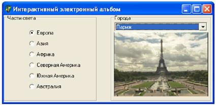 4. Сохраните проект, запустите и протестируйте его. Листинг подпрограммы procedure TForm1. RadioButton1Click (Sender: TObject); var i: Integer; begin ComboBox1.Clear; ComboBox1.Tag:= (Sender as TRadioButton).Tag; for i:= 0 to 5 do ComboBox1.Items.Add (ListBox1.Items [ComboBox1.Tag + i]); ComboBox1.ItemIndex:= 0; Imagel.Picture.LoadFromFile (ListBox2.Items [ComboBoxl.Tag]); end; procedure TForml.FormCreate(Sender: TObject); begin RadioButtonlClick(RadioButtonl); end; procedure TForml.ComboBoxlChange (Sender: TObject); begin Imagel.Picture.LoadFromFile (ListBox2.Items [ComboBoxl.Tag + ComboBoxl.Itemlndex]); end;