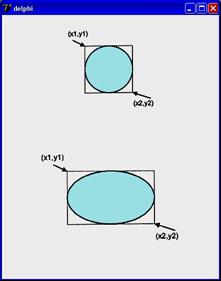 Метод Ellipse вычерчивает эллипс или окружность, в зависимости от значений параметров. Инструкция вызова метода в общем виде выглядит следующим образом: Объект.Canvas.Ellipse(x1,y1, х2,у2] где: Ø объект — имя объекта (компонента), на поверхности которого выполняется вычерчивание; Ø x1, y1, х2, у2 — координаты прямоугольника, внутри которого вычерчивается эллипс или, если прямоугольник является квадратом, окружность (рис. 10.6).