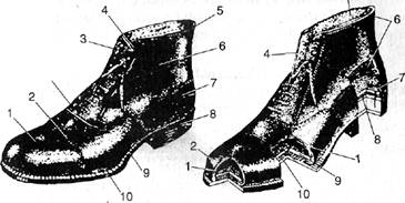 Основная функция обуви - защита ноги человека от неблагоприятного действия внешних факторов (влаги, грязи, низких и высоких температур, электрического тока, укусов насекомых и т. д.) и создание удобства для работы и отдыха стопы. К кожаной относят обувь с верхом из натуральных кож, текстильных и трикотажных материалов, искусственных и синтетических кож, а также с комбинированным верхом из перечисленных материалов. Виды обуви. В основу деления обуви на виды положена высота заготовки верха или степень закрытия стопы и голени деталями верха обуви. Обувь делят на пять основных видов: сапоги, полусапоги, ботинки, полуботинки, туфли. Сапожки, полусапожки, мокасины, сандалеты, пантолеты, опанки, чувяки, сандалии являются разновидностями основных видов обуви. Детали обуви. По выполняемым функциям и защите тех или иных участков стопы они делятся на детали верха и детали низа обуви (рис. 5.4). Детали верха прикрывают тыльную и боковые поверхности стопы и определяют эстетические свойства обуви. Детали низа расположены под следом (плантарной поверхностью) стопы и защищают ее от неблагоприятного ^воздействия грунта. По месту расположения деталей в обуви их делят на наружные, внутренние и промежуточные (табл. 5.2, рис. 5.4).