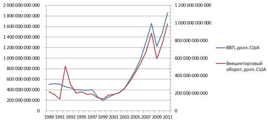 Рис. 4. Динамика ВВП и внешнеторгового оборота России 1989-2011 гг. Построено по данным Всемирного банка