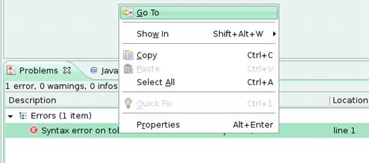 Рис. 10. Комментарий к ошибке · Щелкните кнопку«Закрыть» ("X") на вкладке редактора, что бы его закрыть. · В представлении Problems, выберите проблему из списка. Открыв его контекстное меню и выберите «Go To» (рис. 11). Файл откроется в редакторе на проблемном месте.