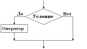 Рисунок 2. Неполная развилка Таким образом, конструкция работает следующим образом: при истинности условия выполняется Оператор1, в противном случае либо Оператор2, либо управление передается следующей за развилкой конструкции. Повторение, или цикл, представляет собой конструкцию, которая состоит, как и выбор, из проверки условия и серии команд. Однако, в отличие от выбора, данная серия команд может выполняться неоднократно, в зависимости от проверки условия. Повторения подразделяются на циклы с предусловием (циклы - пока) и циклы с постусловием (циклы-до).