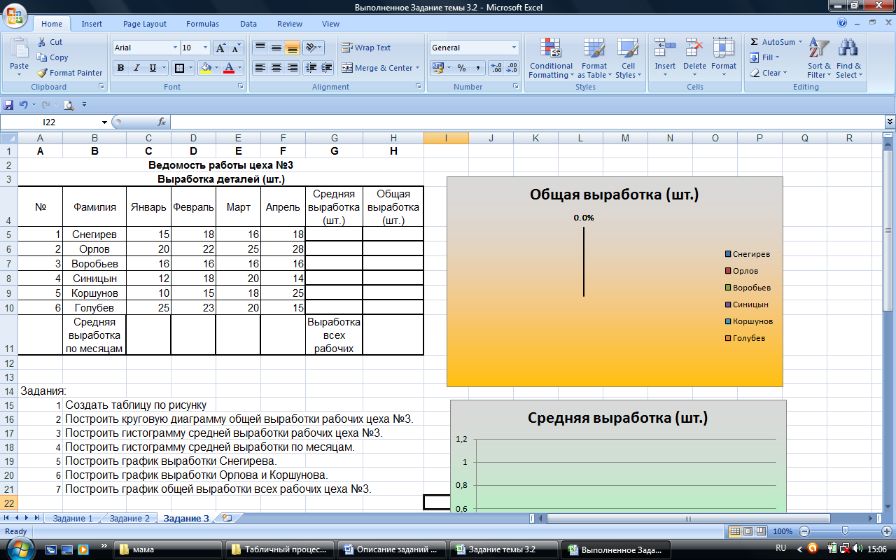Рис. 13 b) Ввести необходимые функции, используя Мастер функций. c) Построить круговую диаграмму общей выработки рабочих цеха №3: · Вкладка Вставка - выбрать вид диаграммы отформатировать ее по образцу, используя инструменты вкладки Формат.