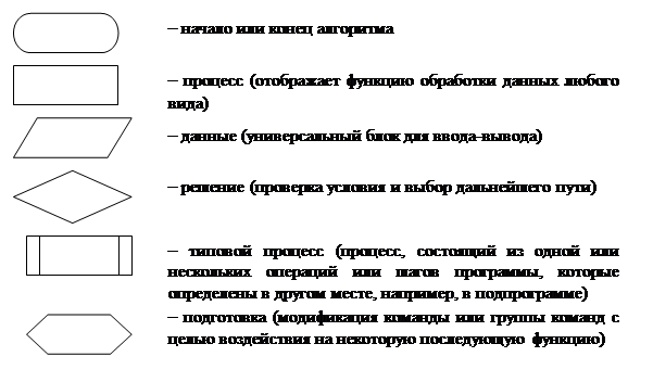 Краткие теоретические сведения Алгоритм. Алгоритмизация Любое явление или процесс состоит из последовательности действий, команд, указаний, выполнения конечного числа инструкций. При этом сложные действия могут быть разбиты на элементарные. Алгоритм – последовательность предписаний исполнителю, применяемых по строго определенным правилам, которая приводит к решению поставленной задачи. Разработка алгоритма для любой задачи является творческим, наиболее ответственным и важным этапом, определяющим эффективность решения задачи в целом. Алгоритмизация – процесс решения задачи, состоящий в нахождении алгоритма решения задачи по ее формулировке. Процесс составления алгоритма ориентирован на конкретного исполнителя. Поэтому при рассмотрении алгоритмов правильнее говорить об алгоритмической системе. Алгоритмическая система (АС) – совокупность средств и понятий, которые допустимы к использованию в алгоритме на этапах разработки и исполнения. При составлении алгоритмов мы будем ориентироваться на систему программирования Visual Basic Условные обозначения процессов в алгоритмах Схема алгоритма – графическое представление вычислительного процесса в виде имеющих заданное значение символов, определяющих действия, краткого пояснительного текста и соединяющих линий, задающих порядок выполнения этих действий. Оформление алгоритма в виде схемы регламентируется стандартом ГОСТ 19.701-90 "Схемы алгоритмов, программ, данных и систем. Условные обозначения и правила выполнения". Он определяет набор и назначение плоских фигур, допустимые варианты записей внутри фигур, относительные размеры блока. Вообще, размеры одного блока допустимо принимать относящимися друг к другу как 3:1. Основные блоки схемы алгоритма