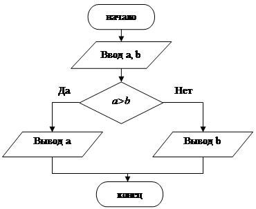 Здесь “Условие” – логическое выражение. При входе в структуру выясняется истинность логического выражения. Если логическое выражение истинно, управление передается по ветви с меткой “Да” и выполняются операторы “Действия 1”, если ложно – то по ветви с меткой “Нет”. Если развилка неполная, то желательно алгоритм разрабатывать таким образом, чтобы продолжение шло по ветви “Да”. Задача 2. Пользователь вводит с клавиатуры два числа. Вывести большее из этих чисел. Алгоритм решения задачи представлен на рисунке 3.