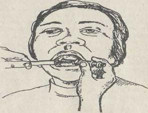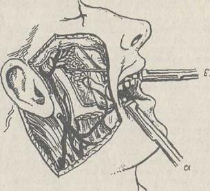 Сурет -31. Көзасты жансыздандыру Ішкі тәсіл — көзасты тесігінің проекциясын анықтаған соң сол қолдың сұқ саусағымен жұмсақ тіндерді сүйекке баса ұстап, бас бармақпен жоғарғы ерінді жоғары, сыртқа қарай ысырады. Бұл кезде ауыз жабық болады. Инені орта және шеткі күрек тістер аралығынан өтпелі қатпарға шаншиды. Көзасты тесігіне бағытталған инені сүйекке тигенге дейін бойлатып, біраз анестетик жібереді. Енді инені әрі қарай жылжытқанда ауырмайтын болады. Ине суқ саусақ тұсына жеткен кезде, оны жайлап жылжытып көзасты тесігін табады. Инені өзекке кіргізбей-ақ тесіктің алдында 0,5-0,75 мл-дей анестетик жібереді. Инені өзекке кіргізіп әрі қарай жылжытып жансыздандырғыш дәрі жіберу көзасты нервісінің жарақаттануына әкеліп соғады.