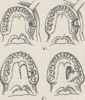 Сурет-54. Гаймор қуысы тесілгенде, тесікті пластикалық әдіспен жабу: а) ұрттан алынған трапсциялы қиындымен; б) қатты таңдайдан алынған тіл тәрізді қиындымен Кей жағдайда тіс жұлынғаннан кейін, гаймор қуысынан тіс ұясы арқылы көп мөлшерде іріңді экссудат ағады, бұл қуыста қабыну кезеңінің жүріп жатқандығының айғағы. Мұндай жағдайда қуысты, тіс ұясы арқылы антисептикалық ерітінділермен жуып, тіс ұясын ашық күйінде қалдырады. Жоғарыда аталған немесе келтірілген мәліметтерге және өзіміздің көп жылдық тәжірибемізге сүйене отырып Гаймор қуысының тесілуі көпшілік жағдайда оның анатомиялық құрылымының ерекшелігіне байланысты екендігін естен шығармау керек. Себебі алғашқы көмек көрсетілетін кезде осындай кедергілер өте маңызды және шешуші тіректердің бірі болып саналады. Тағыда ескерілетін жағдай, ол науқастың көңіл-күйі мен дәрігерге деген көзқарасына байланысты. Егер қуыстың тесілуі бір тістің айналасында болса, оны жергілікті тіндерді ығыстыру арқылы тігіс салып қорғаныш табақшасымен жабады. Бұл іс-қимыл әрекеттер науқасты толық тексеруден өткеннен кейін жасалатын көмек түрлеріне жатады. Жоғарғы жақ қуыстарына белгіленген арнайы әдістер бойынша ота жасалады (гаймор қуысына ығысып өскен ісіктерге ота жасау әдістері оқулықтың арнайы бөлімінде қаралады). 7.5.3. Тіс жұлынғаннан кейін кездесетін асқынулар Қан кетуі. Тіс жұлынуы басқа оталар сияқты қан кетумен өтеді. Қан 4-5 минут шамасында өздігінен немесе тампон жәрдемімен тоқтайды. Алайда кейбір жағдайларда қан кетуі тез арада тоқтай қоймайды, мұндайда біріншілік қан кету немесе отадан бірнеше сағат, бірнеше күн өткен соң екіншілік қан кету деп аталады. Қан кету мерзімі, оның сипаты жергілікті және жалпы себептерге байланысты. Жергілікті себептердің бірі шырышты қабаттың жырылуы болып есептеледі, мұнда ірі артерия, көк тамыр-вена, қан тамырлары (таңдай, тіл, иек-менталь т.б.) жарақаттануы мүмкін. Сүйек тінінің зақымдануы (тіс ұясы қабырғасының жарықшағы, тіс ұясы өсіндісінің өткелдері) көп мөлшерде қан кетуіне алып келеді, себебі сүйек қан тамырлары үңірейіп тұрады. Өте сирек жағдайларда тіс жұлынғаннан кейін-ақ қан кетеді, бұл түбір гемангиомаға жақын жайласқанда болады. Мұндай жағдайда сыртқы ұйқы артериясын байламай немесе ісікті толығымен алып тастамай қан тоқтауы мүмкін емес. Тіс ұясын тампондап, төменгі жақты жоғарғы жаққа қысып бинтпен таңып байлап ауруды ауруханаға жібереді. Тіс ұясынан қан кетуіне алып келетін жалпы жағдайлар қанның ұю қасиетінің нашарлауы, қан тамырларының өткізгіштік қасиетінің ұлғаюы. Олардың қатарына: гемофилия, Верльгоф ауруы, цинга, лейкоз жатады. Жұқпалы аурулар (безгек, скарлатина, эндокардит). Сондай-ақ қан қысымы жоғары немесе антикоагуланттар қабылдап жүрген адамдарда қан кетуі байқалуы мүмкін. Қан кетуді болдырмаудың алдын алу үшін дәрігер науқастан бұған дейін тіс жұлдырғанда қан кетудің болған-болмағанын анықтап алуы керек. Анықтау барысында науқасты арнайы дайындау керек болса, операцияны ауруханада өткізген тиімді болады. Жергілікті себептермен болатын қан кетулерді болдырмау үшін пародонт тіндерін көп жарақаттамай, тіс жұлу отасының барлық ережелерін мұқият сақтау қажет. Жедел ағымды қабыну кезеңінде тіс ұясынан қан кетуі, қан тамырларының кеңеюі мүмкін. Ал кешеуілдетіп қан кетуі, тромбтың бұзылуынан (тіс ұясын